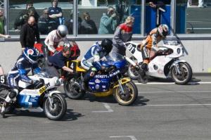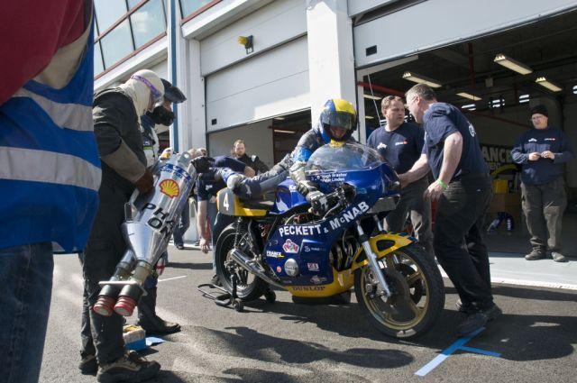 Huge Brasher started fairly cleanly again in race 2 and steadily reeled off 27 straight laps to hand over to Linden at 60 mins whilst holding 11th position. Again the MotoBel Guzzi had taken an early lead, with Haquin pitting in the first quarter with mechanical trouble, leaving Richard Hubin on the TZ700 GauloisesYamaha to keep the pressure on. After a spell, Hubin also dropped back with a rear tyre puncture. After a 19.3 second pit stop, Linden quickly took up the pace and settled, lapping consistently around the 2mins 1 sec bracket. Things were looking good as he took 4th place 20 mins from the end – but he wasn’t to hold it. In a controversial incident when the pace car entered the track, he was wrongly penalised for passing under a flag, whilst committed to a passing move that couldn’t be avoided. In the end, the 1 minute penalty imposed on the Team robbed it of second place overall. But no hard feelings, it was a great race.