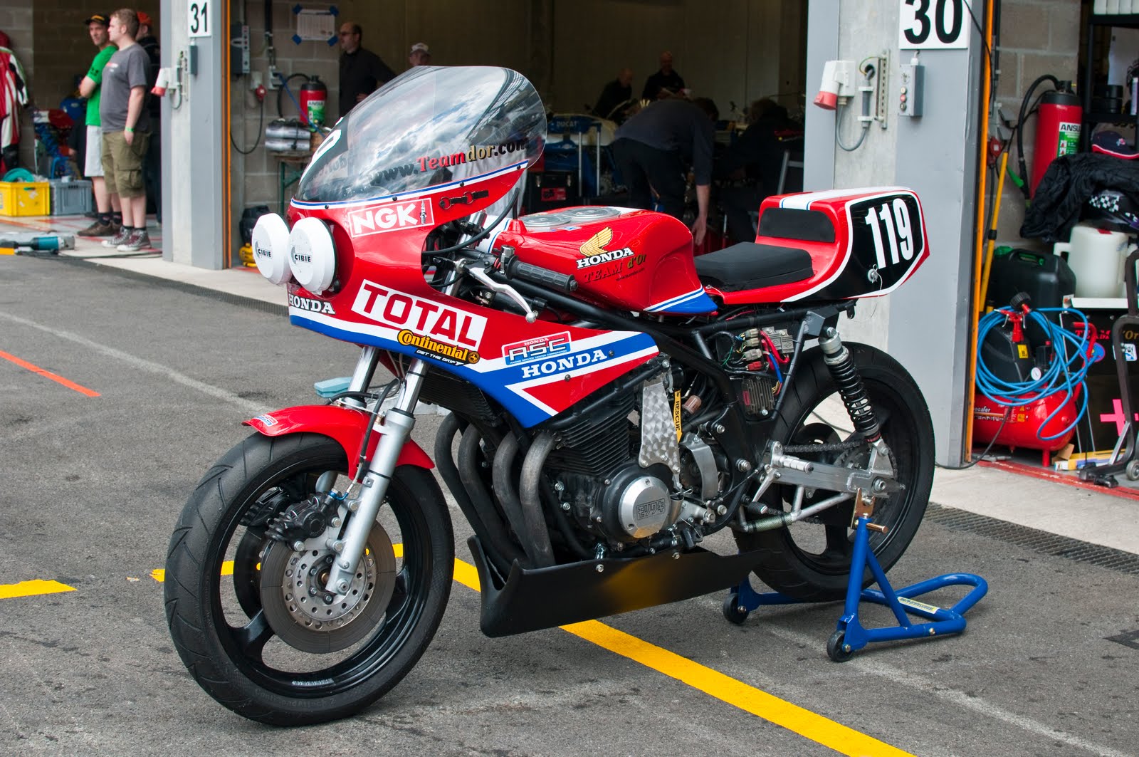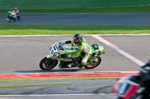 The Brasher/Linden combination started in 66th position as all non-starter motor bikes were at the back, 80 tried to qualify, with the fastest 70 making the grid. Brasher completed the first hour in a fine 30th position, still in daylight conditions. Linden progressed further in the twilight to achieve 8th by the end of rota two. As the darkness fell, the demands on the battery powered lights (we were racing the genuine ex Cowie /Toleman bike which has no alternator) increased. Just as it became fully dark, a light failure occurred which necessitated Brasher to make a headlight change, costing a 119 second stop from 7th. Brasher continued into the darkness to stop 4, which saw the team in 12th place at 23.01hrs, with barely a candle glow from the pair of 55 watt spots. Linden restarted after a battery change and refuel taking 62 secs, to quickly reassert himself and the team, whilst he still had light!. By 23.45 hrs Linden held 6th position, but an unplanned battery change stop at 23.50 hrs costing 27 secs cost a place, before his now-safe cruise of 4 laps to the flag. An excellent weekend’s sport.!