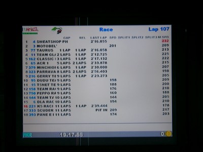 The speed trap times were: Sweatshop Phase One 232kph, Glam 225kph, Classic Racer Shop 222kph, Scuderia 217 kph, Taurus 213kph and Motobel on 209kph.