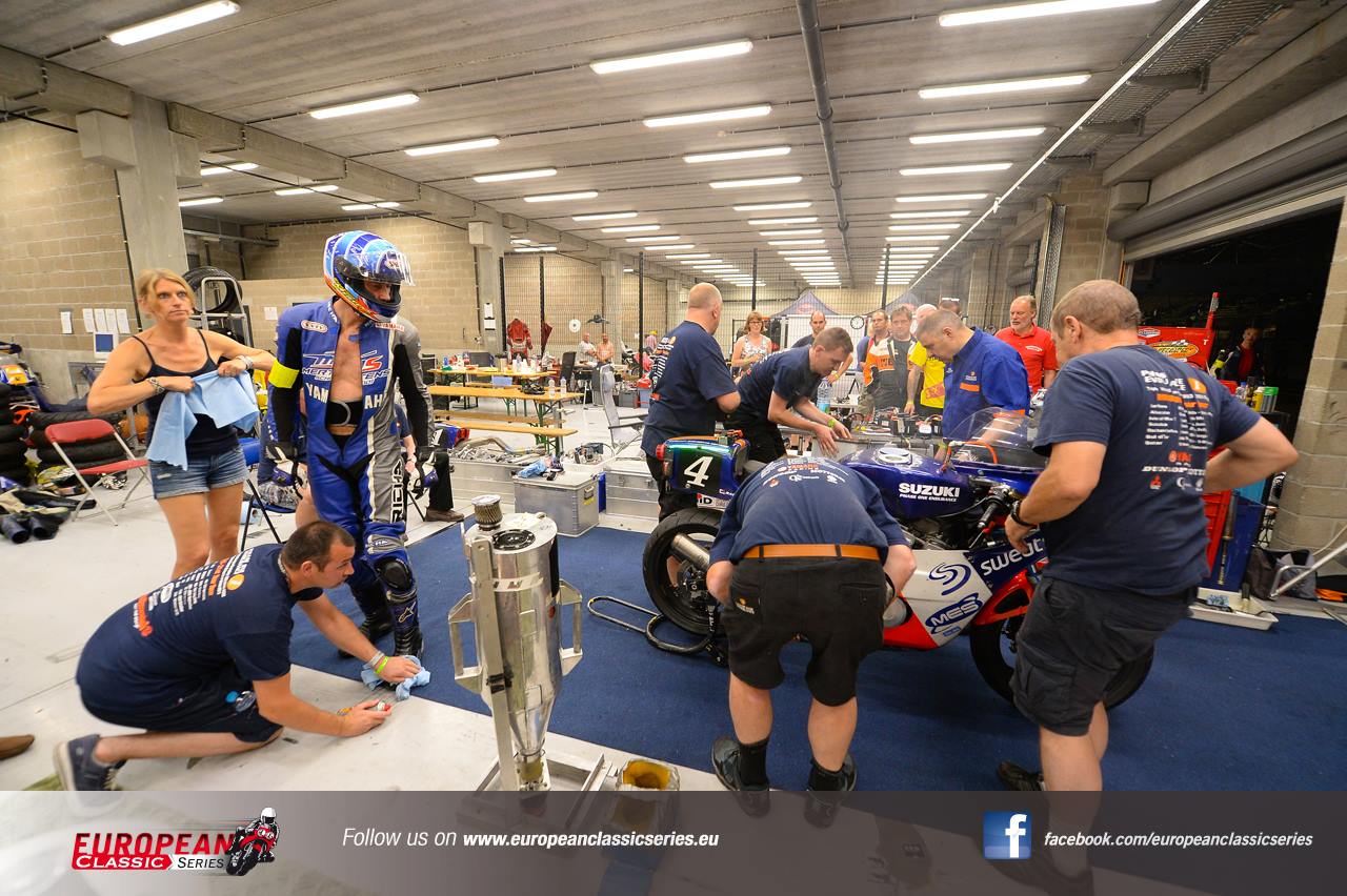 Ian Simpson and Stéphane Mertens raced to pole position during a scorching Friday qualifying, which saw temperatures reach 35 degrees C. For three hours the pair dominated, overcoming challenges in the first rota from Alf’s Endurance (with a wild Mike Edwards, Bob Collins and John Barton aboard) and Team Force’s Greg Fastré. After three hours the Sweatshop Phase One bikes were running first and third after running 1-2 for most of the second hour. With under an hour remaining Mertens stopped at the pit box with a grossly overheated engine, which was also burning oil. Their challenge was over.