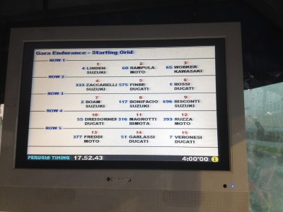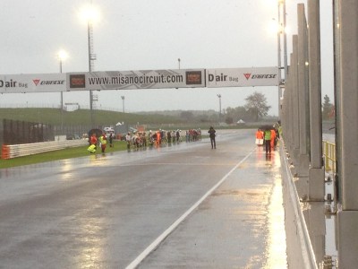Free practice had gone well, in lovely sunny conditions, but the heavens opened for qualifying and the race. Although the thirty or so competitors were soaked, competition was fierce, with sweatshop Phase One eventually scoring pole, with Horvath Guzzi 2nd , Segale 3rd(Kawasaki) and Wobker 4th on another Kawasaki.