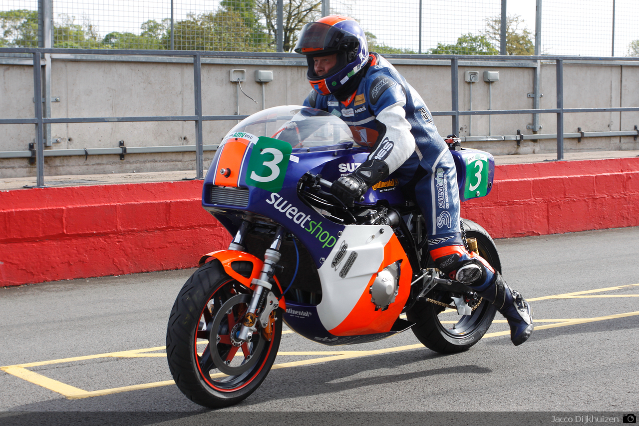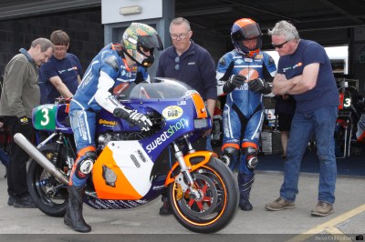 The meeting started on Thursday last with a trackday to test some new items, including Conti’s new 17″ inch front tyres, plus more track familiarisation for Hugh. [as an aside, Conti used Donington Park to launch the new Mark 3 version of the 18″ Road Attack CR race tyre, which we have used so successfully in the CR2 form for 5 years. The CR3 is now available to the public and will surely prove to be the next benchmark in competitive classic racing.] Thursday’s tests were very valuable as a new geometry set-up was found which was used in the race and proved competitive.