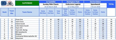 The organisers (in their wisdom) adopted the mid-race scoring system used in the EWC. This is a system which awards up to 10 points for a team’s position at mid-race distance. These points are then added to your race-end position to give you your total. The only one of which we failed to score in was the end position at Osch…
